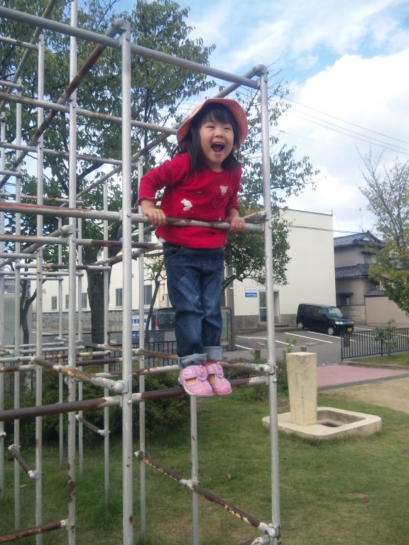 先日お友達と一緒にジャングルジムに登ったのに刺激をうけて2段目にもチャレンジするようになりました。見晴らしがいいので気持ち良さそう・・・。