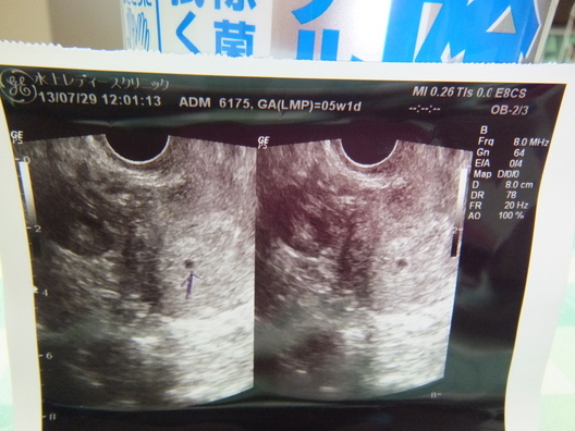 エコーが映し出され、先生が『ここに赤ちゃんいるよ、小さいけど可愛い胎嚢だよ。』そう、言われ恐る恐るモニターを見るととても小さいけれど可愛い胎嚢が