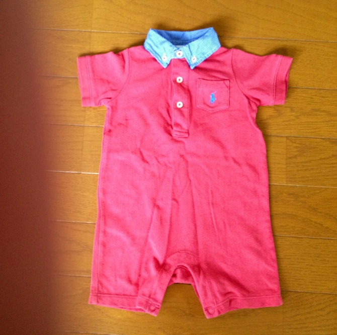 ラルフローレンのポロシャツ型ロンパース(サーモンピンク)、エリはギンガムチェックで、サイズは6Mです。