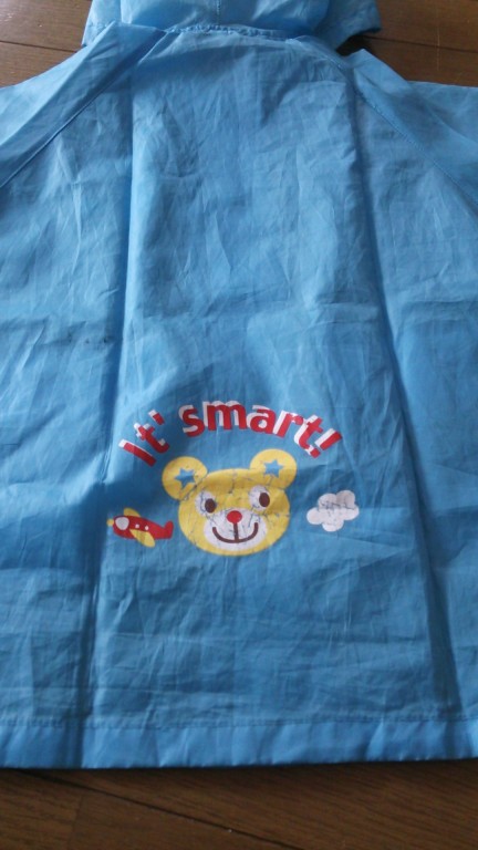 サイズ90の水色レインコートです。絵柄のプリント割れがあります。