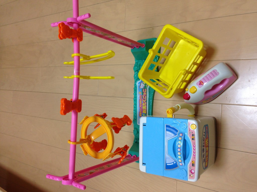 ぽぽちゃんの物干し竿とハンガー2つとピンチハンガーとタテ型洗濯機とアイロンです。