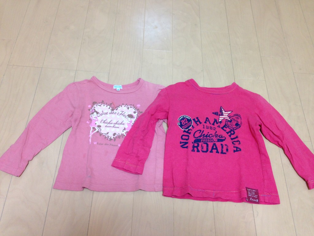 ホットビスケッツピンク長Tシャツ、西松屋ムラサキ長袖Tシャツ、チッカチッカブーンピンク長袖Tシャツ2枚(バレリーナの方に絵の具の汚れあり)、ノーブランド長ズボン、アナと雪の女王長ズボン、JUNKSTORE半ズボン、コムサイズムのセットアップ(95センチ大きめ)、ハッシュアッシュの7分丈2枚、西松屋水玉裏起毛パジャマ、西友オレンジ裏起毛パジャマ、ミニーマウスのスリーパーです。記名はあります。一枚だけ絵の具がついていますが他は汚れはないです。