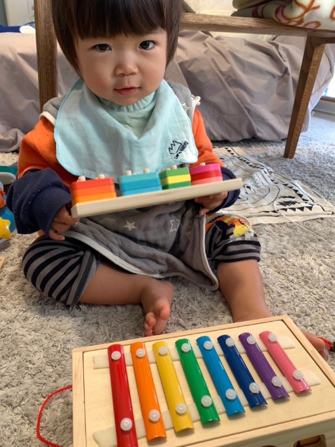 ばぁばサンタさんの素敵なプレゼント、しっかり持ってカメラ目線なところを見ると本当にお気に入りなんだな
