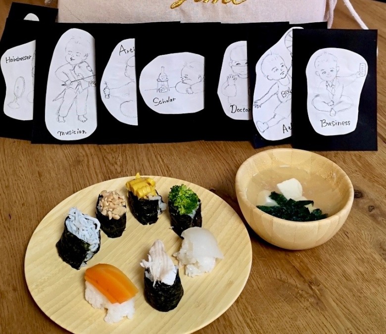 息子と夫が興味のあるバスケットボールや、私が好きなヴァイオリンなどを盛り込んだイラストを描いて、選び取りカードを作りました。