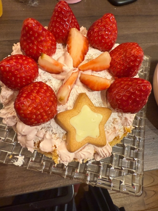 スポンジは私が焼いたので、生クリームを絞って塗るところから教えると、夢中になって塗っていました。