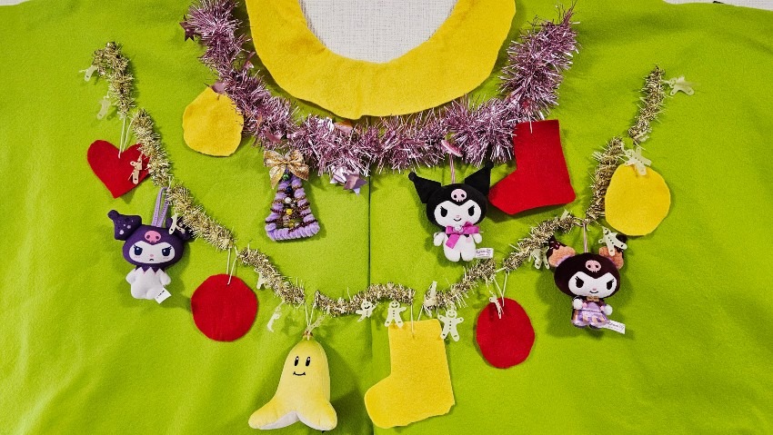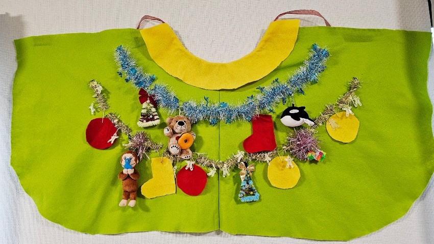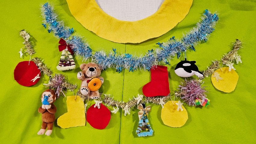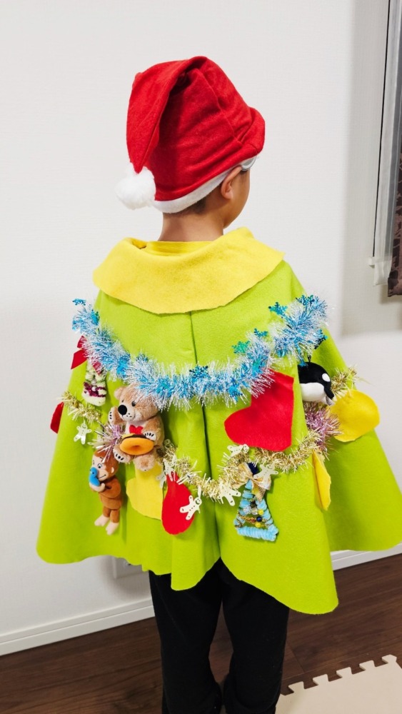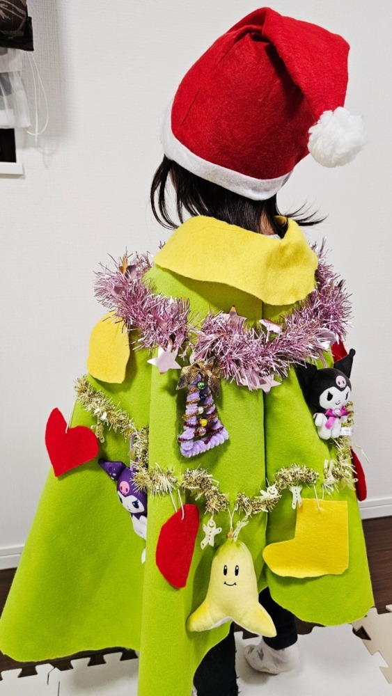 マントの飾り付けもこどもたち自身が考え、手作りのオーナメントに加えて、自宅にあった好きなキャラクターのぬいぐるみやキラキラのモールなど2人が大好きなものをツリーにたくさん飾り付けました!