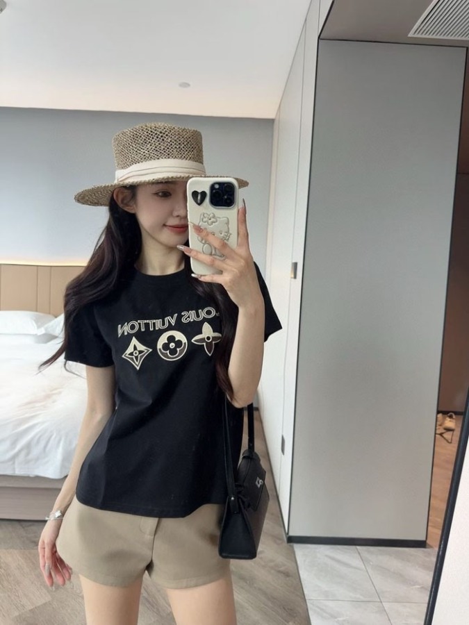春夏新作 ルイヴィトン 刺繍ロゴ 半袖Tシャツ コットン100% ブラック レディース 夏 おしゃれ