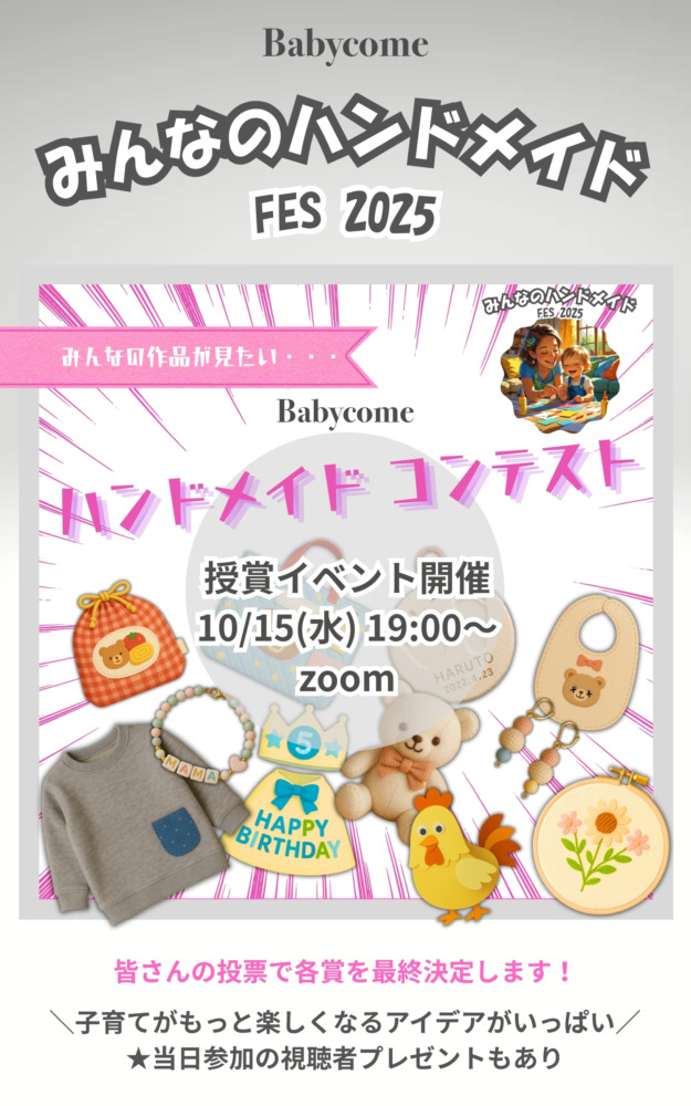 HOME ベビカムニュース ハンドメイドコンテスト 授賞イベント 11/15(水)19時から開催します ハンドメイドコンテスト 授賞イベント 11/15(水)19時から開催します 2025.10.08 ベビカム ハンドメイドコンテスト 授賞イベント 11月15日 19時から zoomで \ あなたも審査委員 / 受賞者の決定方法 1)各賞ごとに、事前にベビカム事務局が3〜6作品をノミネート 2)授賞イベントで、ノミネート作品をご紹介 3)ノミネート作品に対して、参加者が投票 4)投票結果の上位2作品が受賞決定 詳細は下記ボタンから 参加プレゼントもあるよ♪ Tweet Share Pin it RSS 投稿者 ベビカム 事務局 東京都 フォローする
