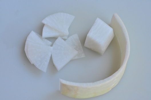 大根はよく洗って、繊維が多い皮を厚めにむき、いちょう切りなど、薄く切る。